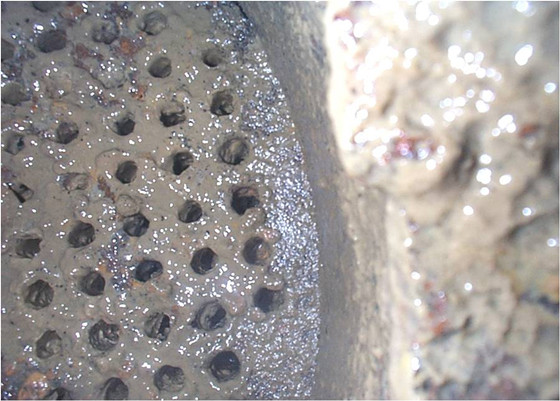 冷凝器藻類滋生問題 u 粘泥軟垢形成原因: 產粘液微生物代謝、懸浮物、一定的水流速度、換熱管壁粗糙度,四個條件形成粘泥軟垢。后面兩個條件是系統客觀存在,解決辦法只能從微生物和懸浮物著手解決。 u 微生物控制: 篩選適合的殺菌滅藻劑,投入適當的水處理殺菌費用,使循環水中微生物含量控制規定范圍內,將微生物代謝粘液保持允許范圍,防止粘泥軟垢的形成。如康凌研發的復合型殺菌滅藻劑KL-115(氧化性)/KL-104(非氧化性),殺菌率達99%以上。 u 懸浮物控制: 增設旁流過濾系統(系統濃縮倍率高/懸浮物高時輔助使用),濾除循環水中懸浮物,控制在規定范圍內,避免懸浮物與微生物黏液相互作用,在系統內累積而沉積換熱管內,形成軟垢,阻止傳熱,同時形成電化學腐蝕。